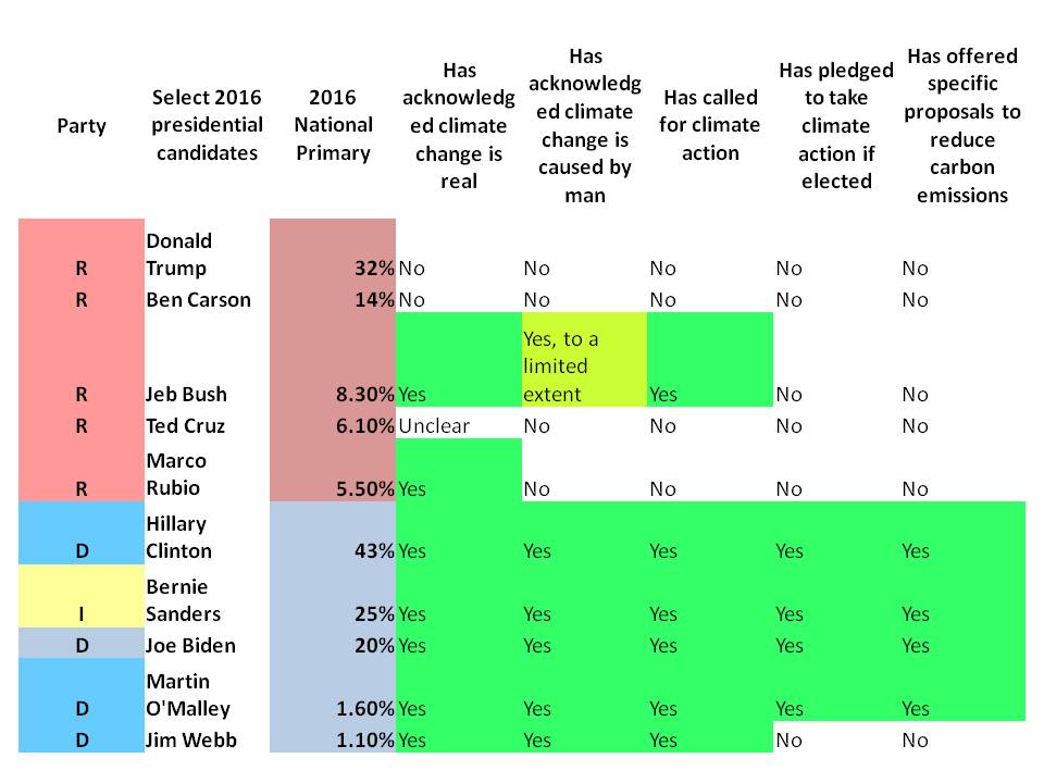 portant) Republican presidential candidates do not believe the scientific consensus and try to make up their own realities, while all democratic candidates seem to trust the world’s climate experts. I have already discussed the reasons for which republicans try to lure voters with their anti climate change positions elsewhere.