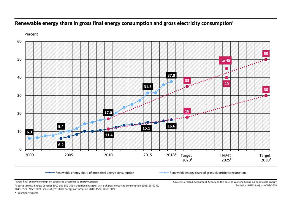In Figure 1 we see Germany’s renewable energy share in gross final energy consumption and gross electricity consumption from the year 2000 to 2018. The dotted lines show the national targets. As one can see, Germany is in line for achieving both 2020 targets. In fact, the 2020 target for its renewable energy share in gross electricity consumption is already overshot and Germany is well in line to achieve its 2025 target during 2019 or 2020 already.