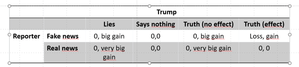 In fact, for a reporter it does not really matter whether (s)he reports this as fake news or real news apart from in one case: if Trump really speaks the truth and falls severely sick, then if the reporter reports this as fake news this could provide a loss to the reporter. Firstly, the reporter reported wrongly, and secondly Trump can claim that all the reporters lie while he himself always speaks the truth, which will undermine the trust in reporters. In all other cases we will never be sure whether Trump speaks the truth or lies, so reporting this to be fake or real news will simply lead to more confirmation bias. Thus, whatever happens, a reporter’s dominant strategy is to report this as real news.